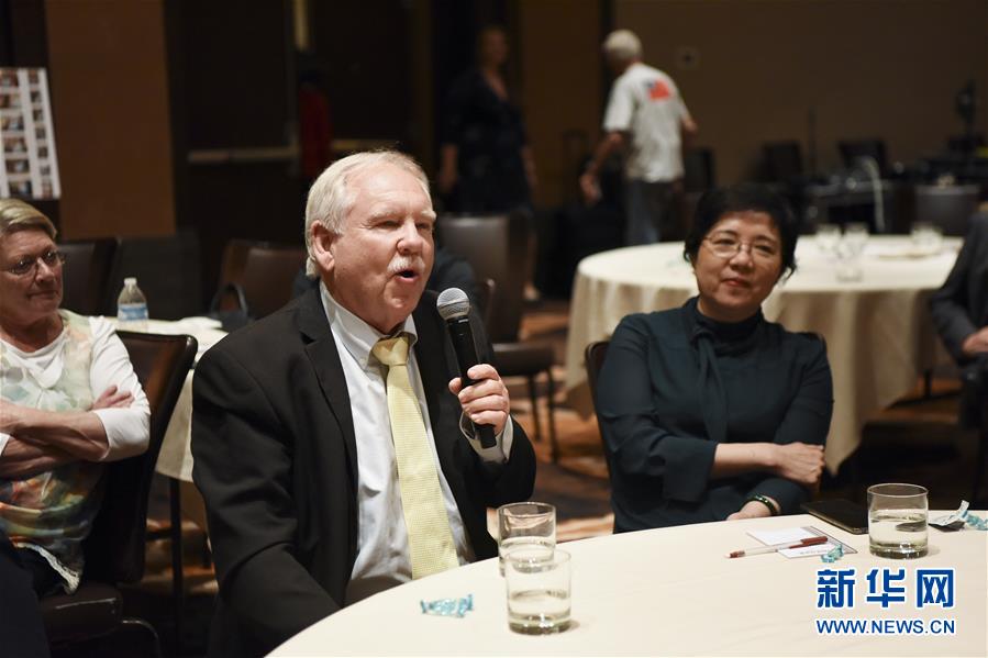 5月11日,在美国拉斯维加斯,美国“飞虎队”老兵格伦·本尼达的儿子爱德华·本尼达(右二)在“飞虎队”历史论坛上发言。 望着湖水里的战机残骸,81岁的美国“飞虎队”老兵格伦·本尼达再难控制自己的感情,泪水涌出眼眶。在他的身边,簇拥着湖北省监利县的村民们。得知“飞虎队”老英雄回来了,人们奔走相告,敲锣打鼓,给予格伦热烈的欢迎。 这是纪录片《飞虎情缘》的一个片段,展现的是2005年格伦重返中国时的场景。5月早些时候,中美航空遗产基金会在美国拉斯维加斯举办了“飞虎队”历史论坛,8名“飞虎队”老兵和约30名亲属应邀出席。格伦·本尼达的长子爱德华·本尼达专门播放了这部纪录片。新华社记者 韩芳 摄