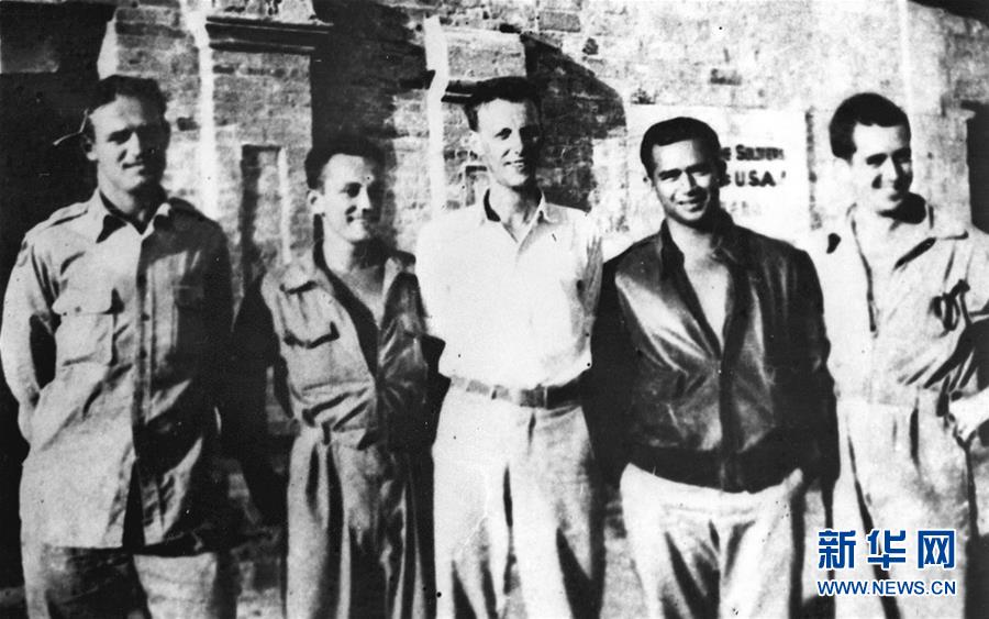 二战期间,被新四军营救的5名美国“飞虎队”飞行员在新四军驻地合影(资料照片,1944年8月摄)。 望着湖水里的战机残骸,81岁的美国“飞虎队”老兵格伦·本尼达再难控制自己的感情,泪水涌出眼眶。在他的身边,簇拥着湖北省监利县的村民们。得知“飞虎队”老英雄回来了,人们奔走相告,敲锣打鼓,给予格伦热烈的欢迎。 这是纪录片《飞虎情缘》的一个片段,展现的是2005年格伦重返中国时的场景。5月早些时候,中美航空遗产基金会在美国拉斯维加斯举办了“飞虎队”历史论坛,8名“飞虎队”老兵和约30名亲属应邀出席。格伦·本尼达的长子爱德华·本尼达专门播放了这部纪录片。新华社发