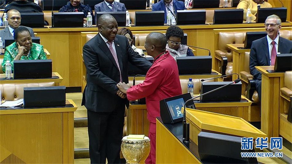 5月22日,在南非开普敦,新当选总统拉马福萨(中左)出席会议。 南非国民议会新当选议员22日选举执政党非洲人国民大会(非国大)推举的候选人拉马福萨为南非总统。当天,南非国民议会新当选议员在立法首都开普敦宣誓就职,并选举非国大推举的候选人莫迪塞为新一届国民议会议长。 新华社发(威廉·穆维 摄)