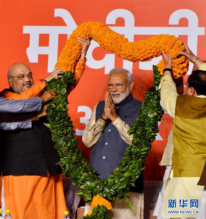 5月23日,在印度新德里的人民党总部,印度总理莫迪(中)庆祝在大选中获胜。新华社发