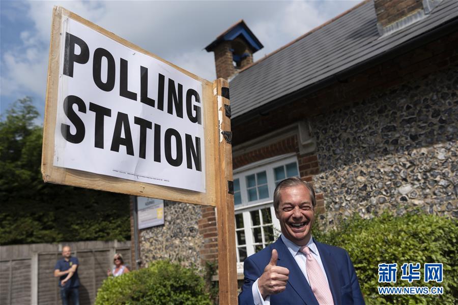 5月23日,在英国比金希尔,“脱欧党”领袖奈杰尔·法拉奇抵达投票站。 五年一次的欧洲议会选举于5月23日至26日举行。 新华社发(雷伊·唐摄)
