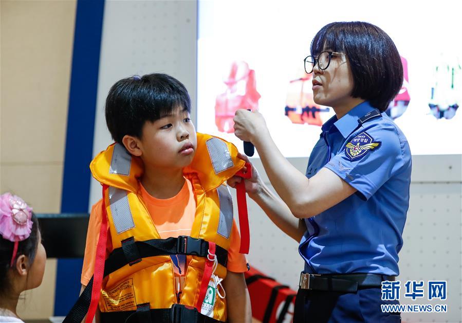 5月24日,在韩国丽水的韩国海洋警察厅教育院,一名海警在向体验者介绍救援设备。 韩国海警于5月24日至25日在全罗南道丽水市组织训练营活动,包括相关设备辨识、海上紧急逃生游泳知识等。 新华社记者 王婧嫱 摄