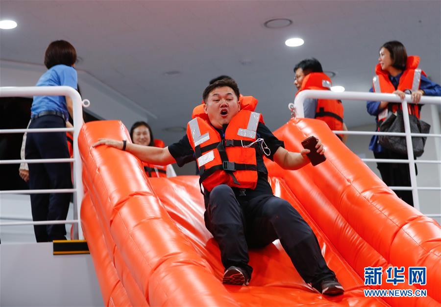 5月24日,在韩国丽水的韩国海洋警察厅教育院,体验者们在游泳池练习落水后的逃生技能。 韩国海警于5月24日至25日在全罗南道丽水市组织训练营活动,包括相关设备辨识、海上紧急逃生游泳知识等。 新华社记者 王婧嫱 摄