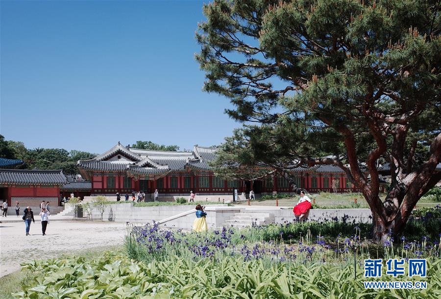 5月21日,身着传统韩服的游客在韩国首尔昌德宫内游览。 新华社记者 王婧嫱 摄