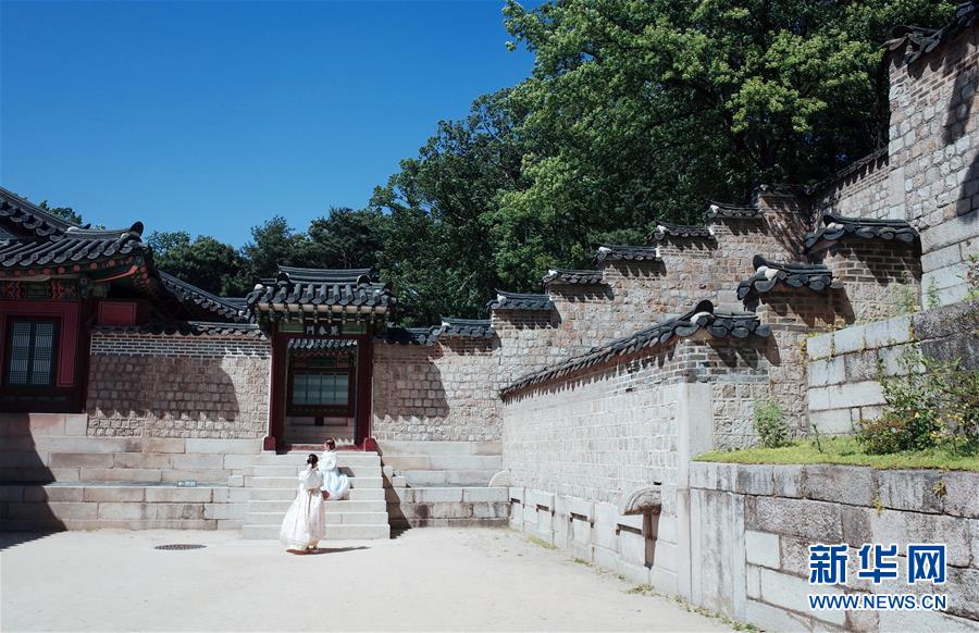 5月21日,身着传统韩服的游客在韩国首尔昌德宫内游览。新华社记者 王婧嫱 摄