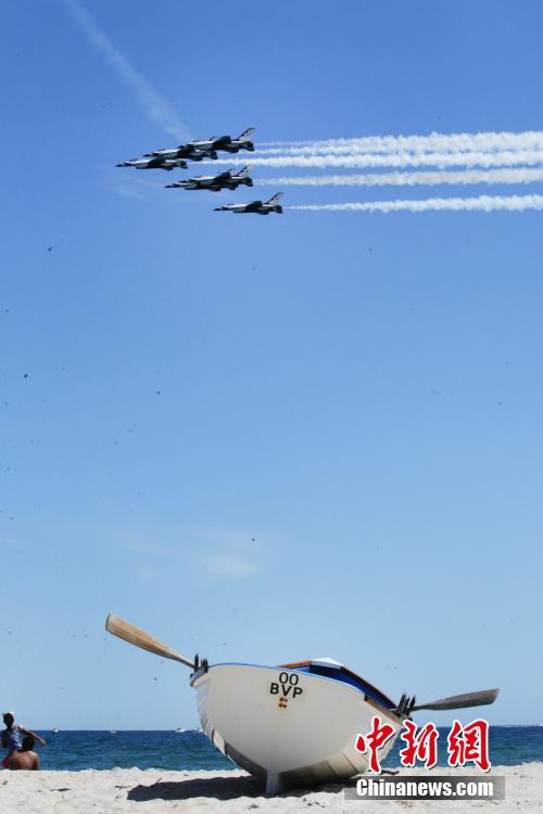 当地时间5月25日,在美国纽约州琼斯海滩上空,美国空军“雷鸟”飞行表演队进行飞行表演。当天,琼斯海滩上演一年一度的飞行秀,吸引众多游客前来观看。中新社记者 廖攀 摄