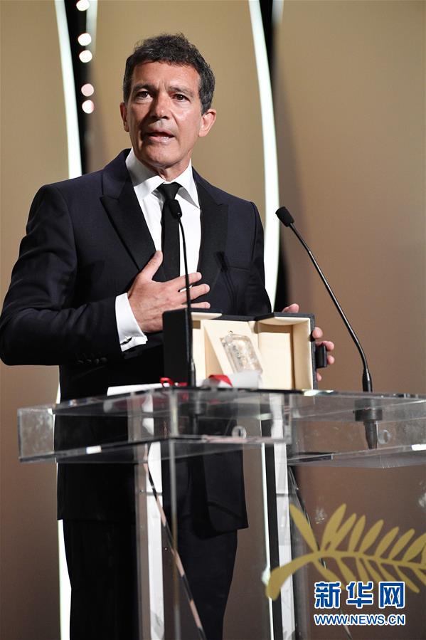 5月25日,在法国戛纳,获得最佳男演员奖的影片《痛苦与荣耀》的西班牙演员安东尼奥·班德拉斯在闭幕式上发表获奖感言。 第72届戛纳电影节25日闭幕。 新华社发(凯姆·伊达摄)