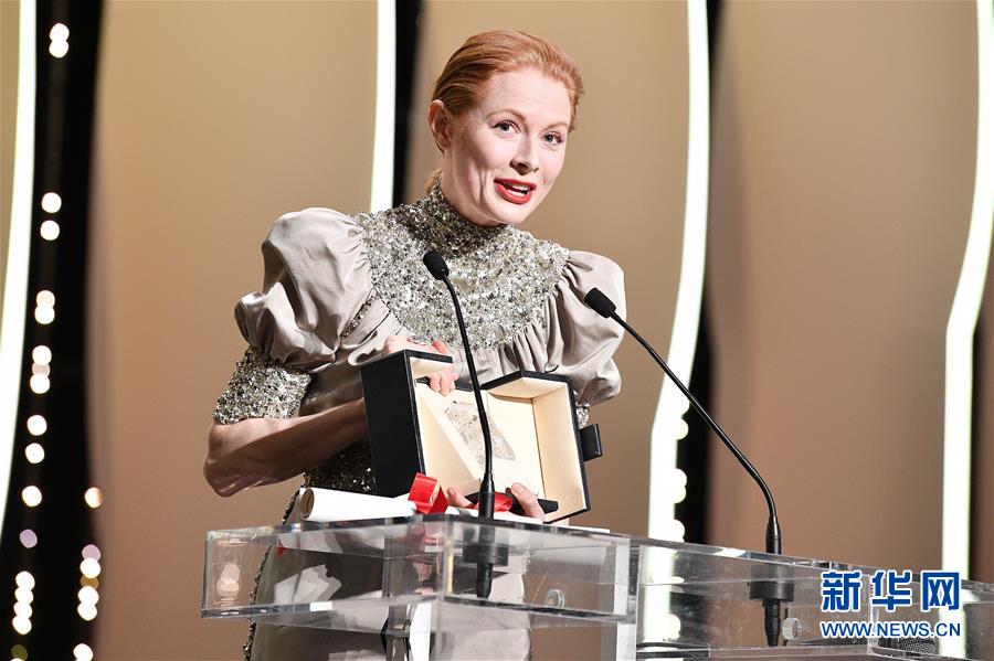 5月25日,在法国戛纳,获得最佳女演员奖的影片《小小乔》的女主角、英国女演员埃米莉·比彻姆在闭幕式上发表获奖感言。 第72届戛纳电影节25日闭幕。 新华社发(凯姆·伊达摄)