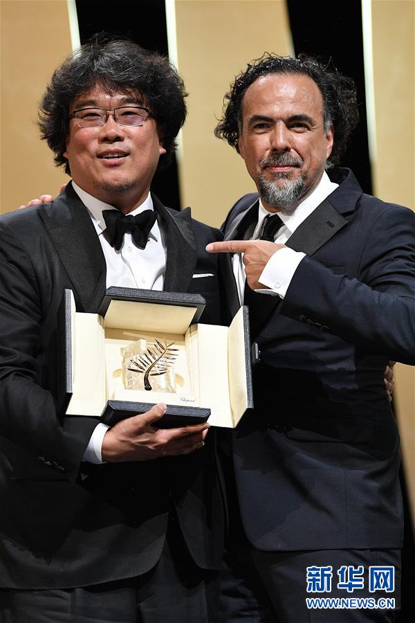 5月25日,在法国戛纳,获得最高奖最佳影片金棕榈奖的影片《寄生虫》的韩国导演奉俊昊(左)出席闭幕式。 第72届戛纳电影节25日闭幕。 新华社发(凯姆·伊达摄)