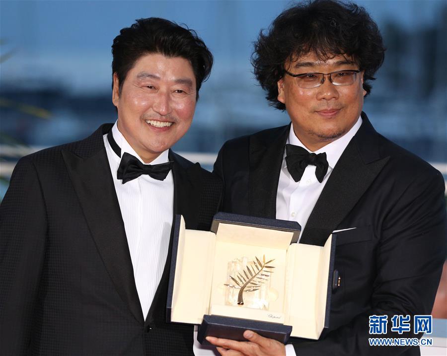 5月25日,在法国戛纳,韩国导演奉俊昊(右)与演员宋康昊手捧金棕榈奖杯出席拍照式。韩国导演奉俊昊凭借影片《寄生虫》将最高奖最佳影片金棕榈奖揽入囊中。 第72届戛纳电影节25日闭幕。 新华社记者 高静 摄