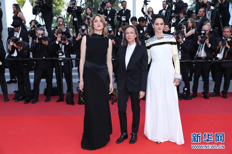 5月25日,在法国戛纳,获最佳编剧奖的影片《燃烧女子的肖像》导演兼编剧塞利娜·夏马(中)携部分主创亮相闭幕红毯。 第72届戛纳电影节25日闭幕。 新华社记者 张铖 摄