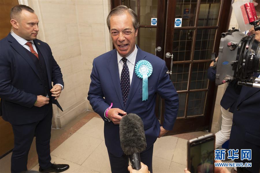 5月26日,在英国南安普敦,“脱欧党”领袖奈杰尔·法拉奇抵达一个计票站。 五年一次的欧洲议会选举23日至26日在欧盟28个成员国间举行。选民将选举出751名议员,组成第九届欧洲议会,任期5年。 新华社发(雷伊·唐摄)