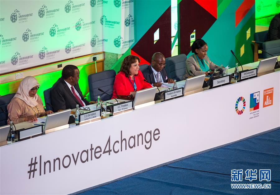 5月27日,在肯尼亚内罗毕,首届联合国人居大会主席玛尔塔·德尔加多·佩拉尔塔(左三)在开幕式上发言。 首届联合国人居大会27日在肯尼亚首都内罗毕召开大会。此次大会以“创新让城市和社区生活更美好”为主题,旨在为全球城镇化面临的挑战找到创新、可持续的应对之策。 新华社记者 吕帅 摄