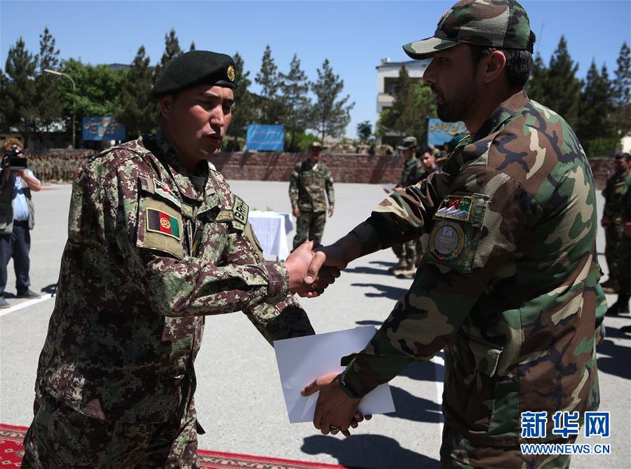 5月27日,在阿富汗喀布尔军事训练中心,士兵在毕业典礼上接过证书。 当日,两千余名阿富汗军官和士兵从喀布尔军事训练中心毕业,加入阿富汗国民军。 新华社发(拉赫马特·阿里扎达 摄)