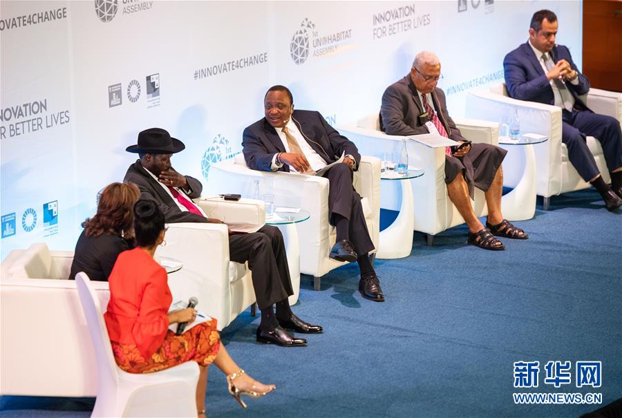 5月29日,在肯尼亚首都内罗毕,肯尼亚总统肯雅塔(右三)在首届联合国人居大会高级别会议上发言。