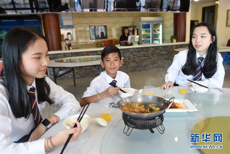 5月29日,沙利(中)与同学在留学生餐厅聚餐。 14岁的柬埔寨少年沙利是一名“网红”。2018年11月,家境贫寒的他在吴哥窟附近用10多种不同语言兜售旅游纪念品的视频,经网络传播后引发广泛关注。出众的语言天赋改变了沙利的命运,受益于一家中国民办教育机构的“一带一路”国际英才留学中国公益项目,今年5月中旬,沙利来到位于浙江省诸暨市的海亮外国语学校,开始在中国的求学生活。 “现在的学校太漂亮了,我想以后去北京上大学!”沙利对新的学习和生活环境充满期待。沙利的高中、大学及后续求学费用将由学校持续资助,来自柬埔寨的贫困少年将在中国开启圆梦之旅。 新华社记者 韩传号 摄