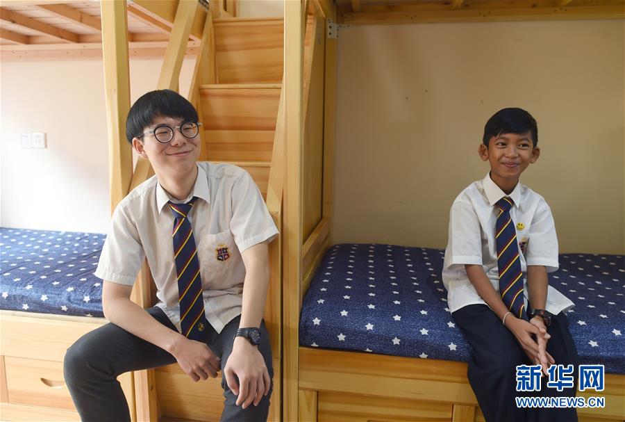 5月29日,沙利(右)和同班同学、一名来自韩国的留学生在宿舍里。 14岁的柬埔寨少年沙利是一名“网红”。2018年11月,家境贫寒的他在吴哥窟附近用10多种不同语言兜售旅游纪念品的视频,经网络传播后引发广泛关注。出众的语言天赋改变了沙利的命运,受益于一家中国民办教育机构的“一带一路”国际英才留学中国公益项目,今年5月中旬,沙利来到位于浙江省诸暨市的海亮外国语学校,开始在中国的求学生活。 “现在的学校太漂亮了,我想以后去北京上大学!”沙利对新的学习和生活环境充满期待。沙利的高中、大学及后续求学费用将由学校持续资助,来自柬埔寨的贫困少年将在中国开启圆梦之旅。 新华社记者 韩传号 摄