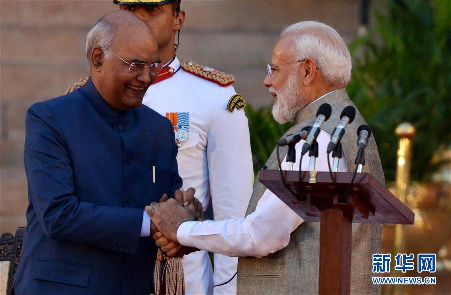 5月30日,在印度首都新德里的印度总统府,印度总统科温德(左前)祝贺宣誓就职的印度总理莫迪。 当日,成功获得连任的印度总理莫迪在首都新德里宣誓就职,开启他的第二个总理任期。 新华社发