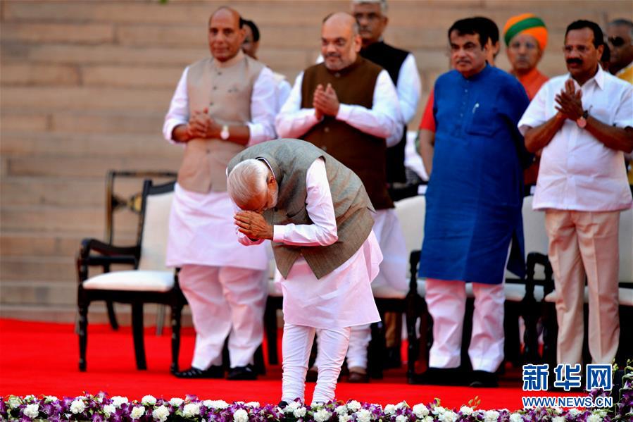 5月30日,在印度首都新德里的印度总统府,莫迪(前)在宣誓就职仪式上向支持者致意。 当日,成功获得连任的印度总理莫迪在首都新德里宣誓就职,开启他的第二个总理任期。 新华社发