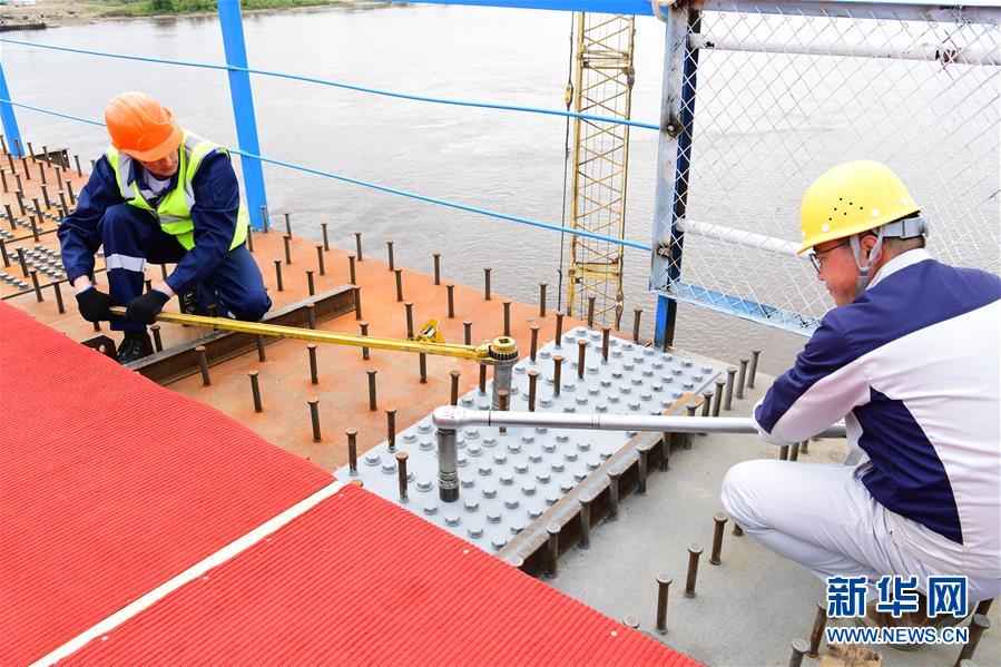 5月31日,中俄双方建设者将螺栓安装到合龙块上。