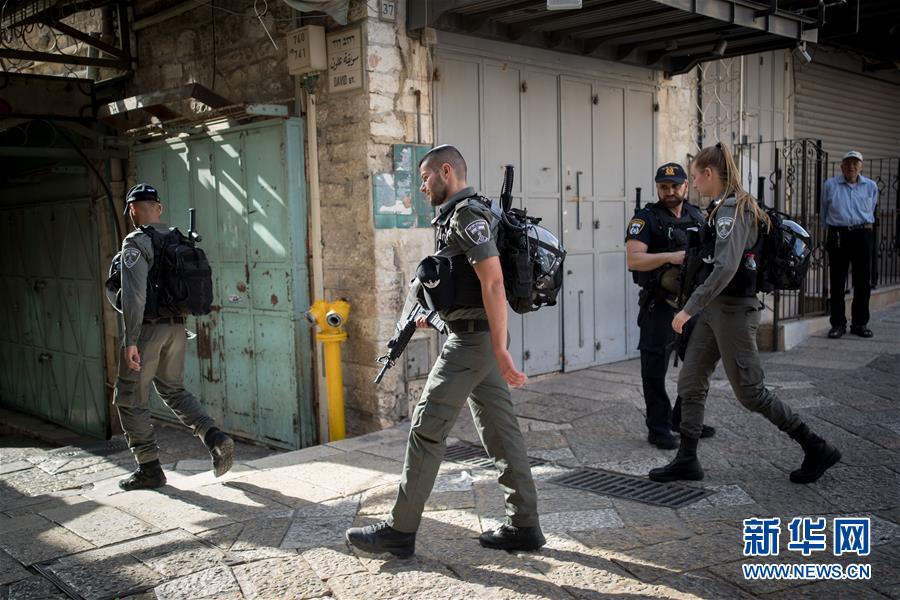 5月31日,在耶路撒冷老城,以色列警察在袭击事件现场警戒。 以色列警方31日说,耶路撒冷老城当天发生持刀袭击事件,一名19岁的巴勒斯坦人刺伤两名以色列人,致其中一人重伤,这名袭击者随后被警察击毙。 新华社/基尼图片社