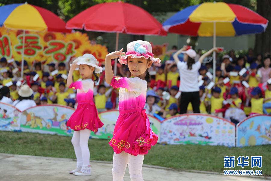 6月1日,在朝鲜平壤的大城山游乐场,孩子们在跳舞。 新华社记者 程大雨 摄