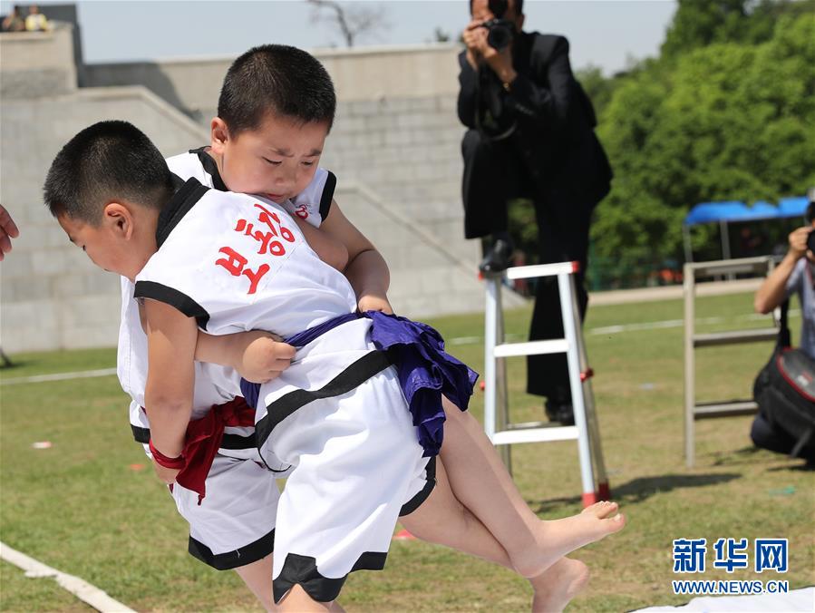 6月1日,在朝鲜平壤的大城山游乐场,孩子们进行摔跤比赛。新华社记者 程大雨 摄