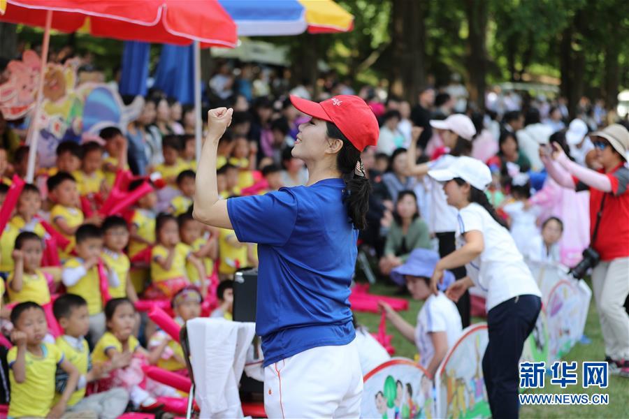 6月1日,在朝鲜平壤的大城山游乐场,一名幼儿园教师指挥孩子们为比赛加油呐喊。新华社记者 程大雨 摄