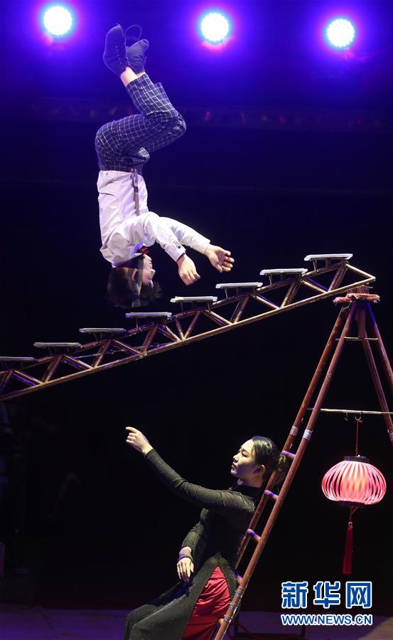 6月1日,在乌克兰首都基辅,中国深圳福永杂技团演员在颁奖典礼上表演《头顶倒立》。