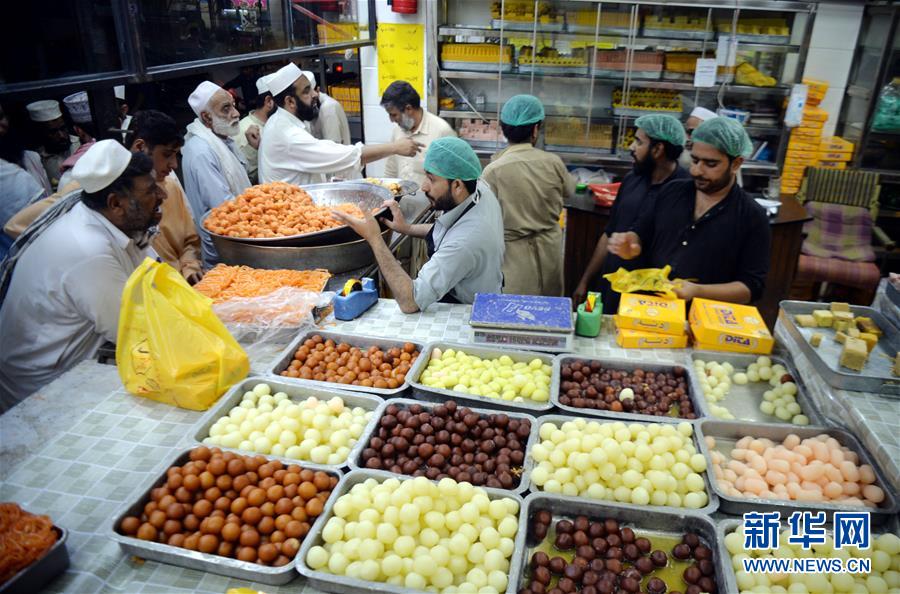 6月4日晚,在巴基斯坦白沙瓦,人们购买甜品,迎接即将到来的开斋节。 新华社发(奥马尔·卡尤姆摄)