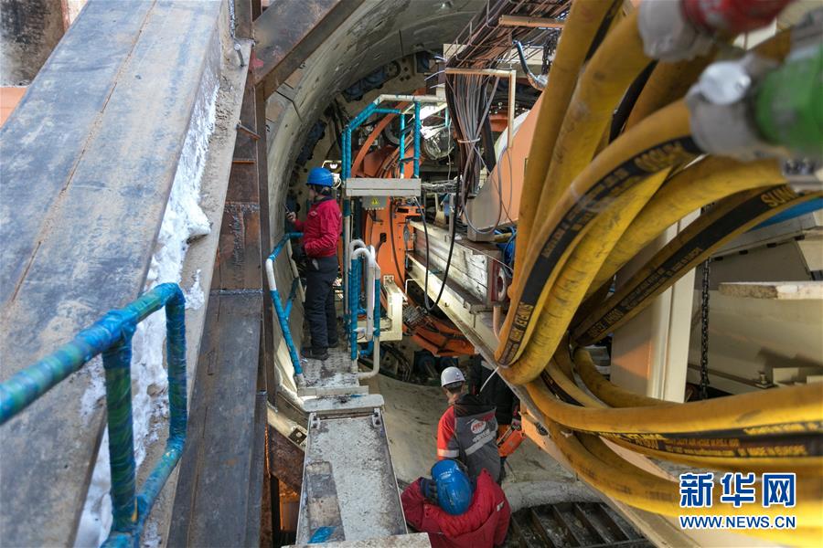 1月25日,在俄罗斯首都莫斯科,施工人员在“玛利亚”号盾构机内部工作。 新华社记者白雪骐摄