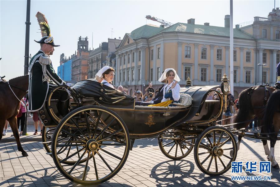 6月6日,在瑞典斯德哥尔摩,瑞典王后西尔维娅与索菲亚王妃(右一)前往市中心的斯堪森公园,与民众共同庆祝瑞典国庆日。 6月6日是瑞典国庆日。 新华社发(魏学超摄)