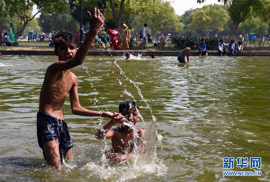 6月7日,在印度首都新德里,两名男孩在水池内玩耍。 自印度国家气象局2日发布高温预警以来,印度多地持续高温天气。 新华社记者张迺杰摄