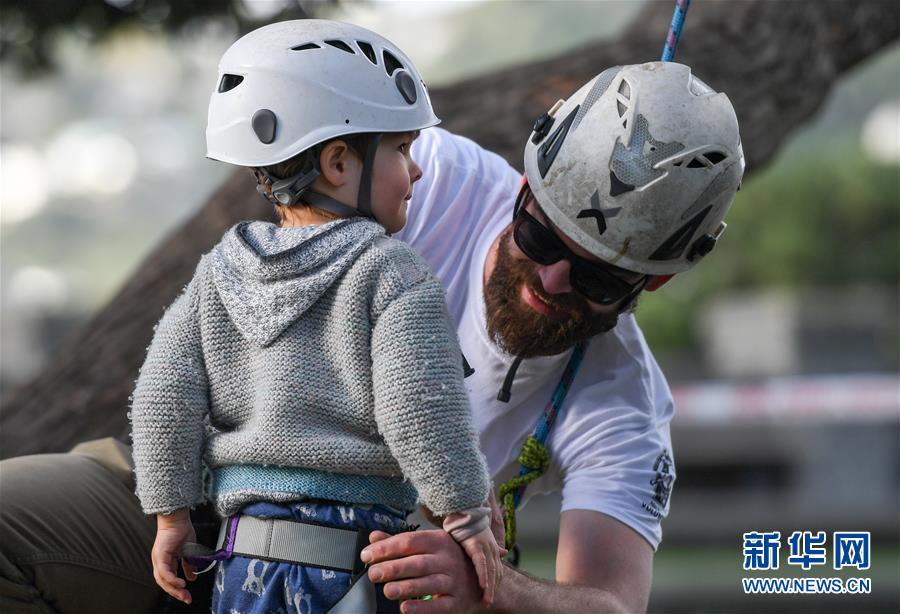 6月8日,在新西兰首都惠灵顿的市中心,专业人员检查一名儿童爬树前的装备。 当日,惠灵顿市政厅组织“爱树周”亲近自然活动。参与活动的儿童们在专业工作人员的保护和指导下体验爬树。 新华社记者 郭磊 摄