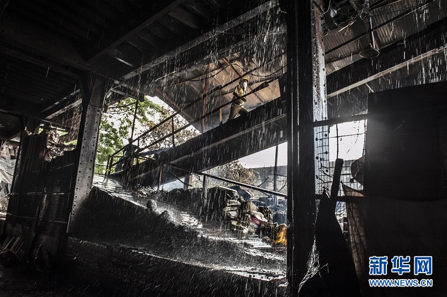 6月8日,在印度加尔各答市,消防人员在火灾现场灭火。 当日,印度加尔各答市一处化学品储存地点发生火灾,附近居民已撤离。 新华社发(通帕·蒙达尔摄)