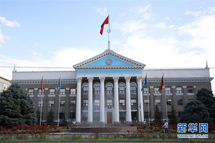 6月5日,两名市民走过吉尔吉斯斯坦比什凯克市政厅。 新华社发(罗曼 摄)