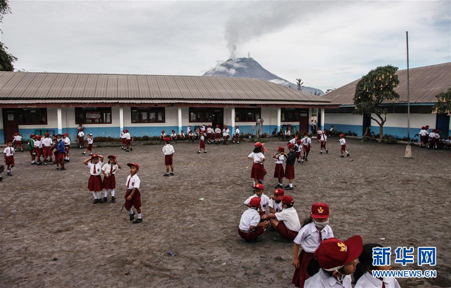 6月10日,在印度尼西亚北苏门答腊省卡罗县,小学生们在教室前的空地上活动,远处的锡纳朋火山正在喷发。 锡纳朋火山位于印尼北苏门答腊省的卡罗县,在沉寂近400年后于2010年首度喷发。该火山近年来进入活跃期。 新华社发(达马尼克摄)