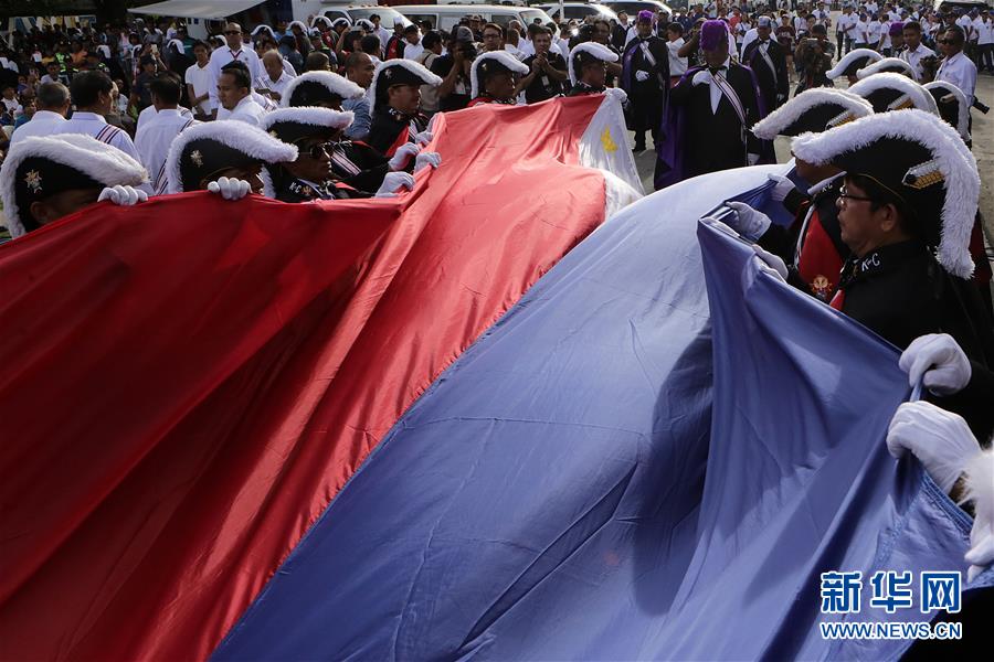 6月12日,在菲律宾甲米地省,人们手持大幅国旗参加独立日庆典。