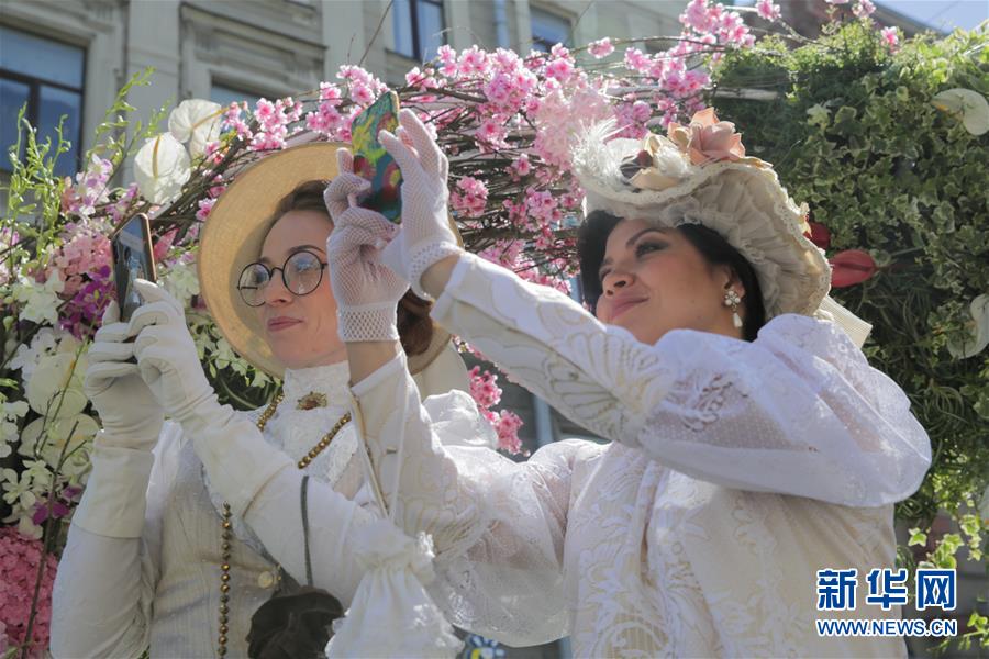 6月12日,人们在俄罗斯圣彼得堡街头参加鲜花大游行,庆祝“俄罗斯日”。 新华社发(莫京娜 摄)