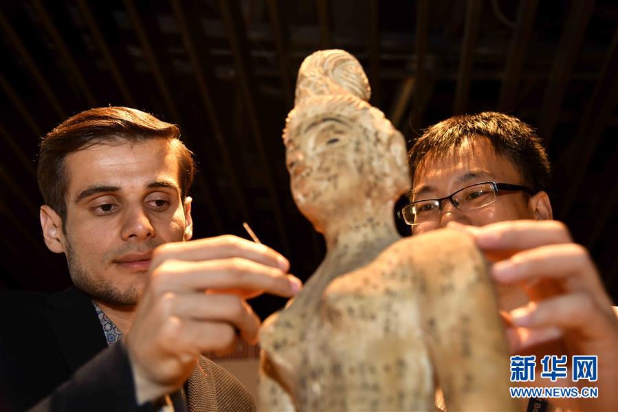 6月12日,在青岛举行的博鳌亚洲论坛全球健康论坛大会中医体验区,安晨(左)在青岛西海岸新区中医医院医师的指导下体验针灸技法。新华社记者 郭绪雷 摄