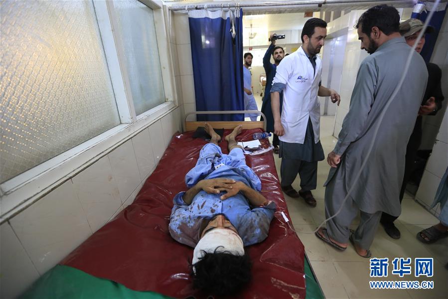 6月13日,在阿富汗东部楠格哈尔省首府贾拉拉巴德市,一名伤者在医院接受治疗。 楠格哈尔省政府发言人阿塔胡拉·胡吉亚尼当日说,贾拉拉巴德市发生一起针对警车的自杀式袭击,导致4名警察和包括1名儿童在内的5名平民死亡,另有11人受伤,袭击者也当场死亡。 新华社发(赛义夫拉赫曼·萨菲 摄)