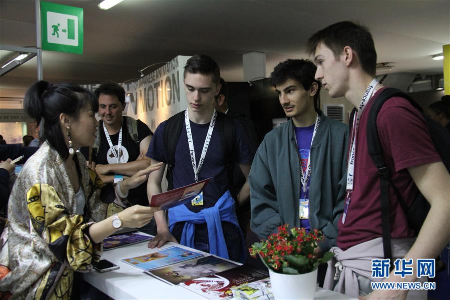 6月13日,在法国阿讷西国际动画电影节上,外国参会者在中国展区了解参展的中国动画作品。 新华社记者 杨一苗 摄