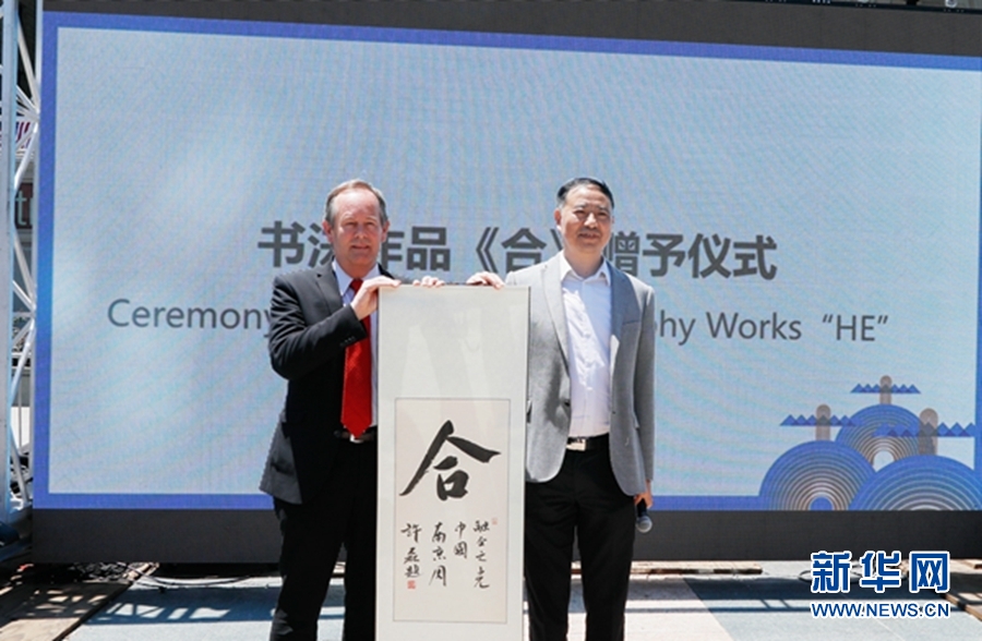 6月12日,南京代表向旧金山市政厅代表赠送书法作品《合》。陈向俞 摄