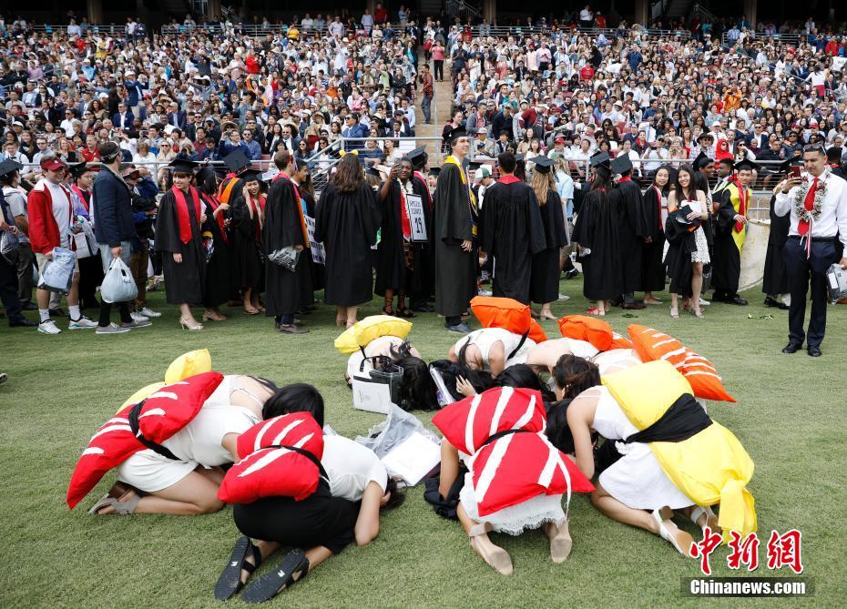 当地时间6月16日,斯坦福大学的毕业生在斯坦福体育馆举行“怪异行走”,庆祝完成学业。毕业典礼以“怪异行走”开场早已成为斯坦福大学的传统,毕业生们或以不同的主题打扮自己,或与同学形成组合进行群体装扮。除了打扮得标新立异之外,许多参加“怪异行走”的毕业生还会带上标语牌,来表达感情或者立场。斯坦福大学官网公布的初步数据显示,今年斯坦福大学将颁发1850个学士学位,2410个硕士学位和1051个博士学位。庆祝活动预计吸引25000至30000名观众。 中新社记者 刘关关 摄