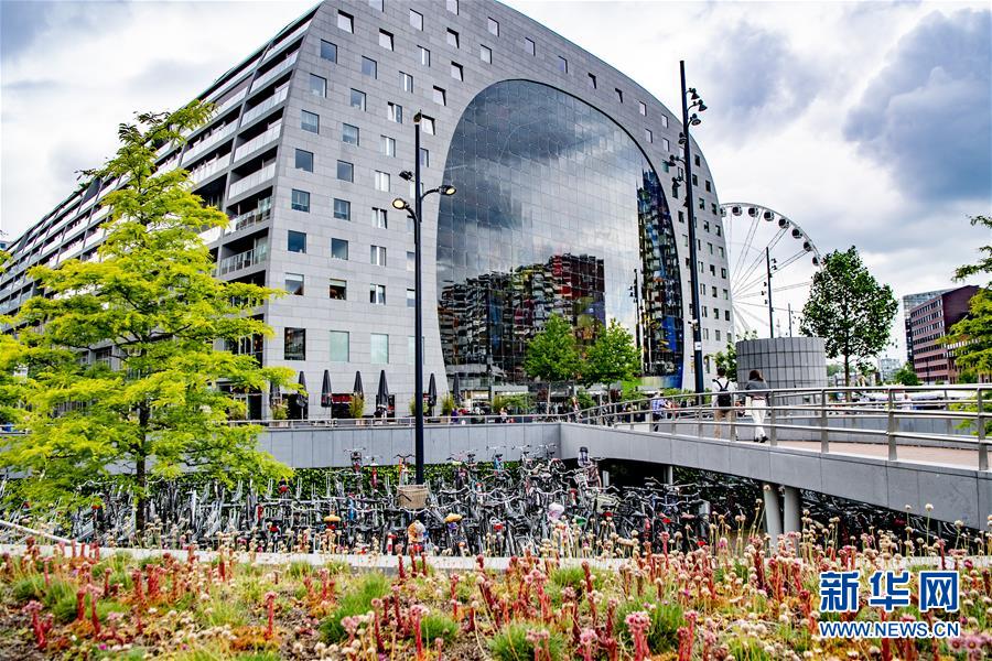 这是6月16日在荷兰鹿特丹缤纷菜市场旁拍摄的自行车停车场。 通过不断更新的城镇化可持续发展战略、持续细化的政策措施和项目实施,荷兰在绿色城市建设方面取得了突出成就。荷兰多地以全面整体的方式对交通、能源、建筑、水资源和垃圾系统进行改进,进一步完善城市功能,打造绿色宜居城市。 新华社发(罗宾·乌得勒支摄)