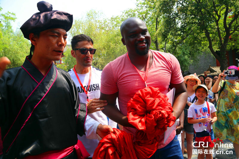 来自津巴布韦的留学生李放(左三)在开封清明上河园内喜当“洋女婿” 摄影 丁旭