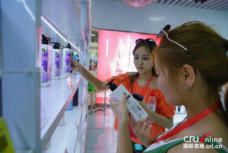 采风团的两名留学生在郑州中大门O2O新零售购物体验中心查看商品信息 摄影 付锐