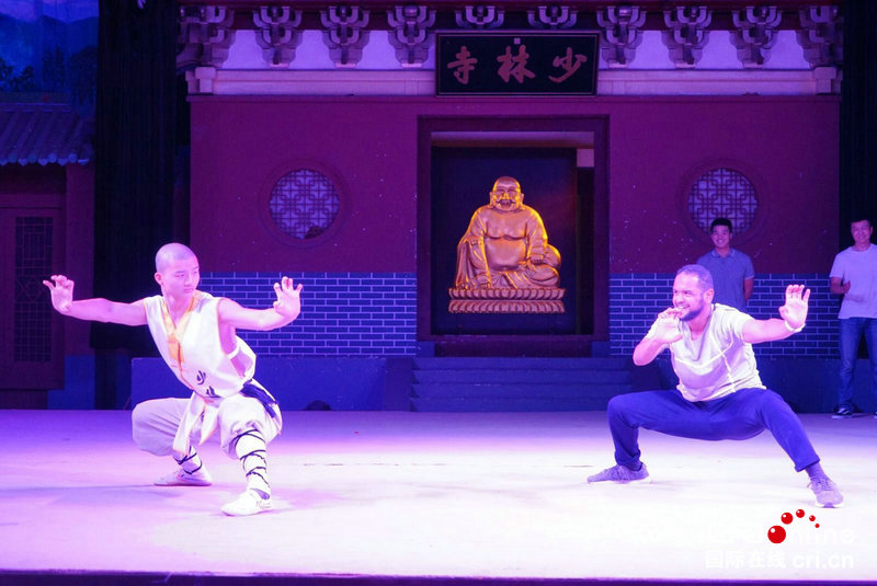 来自苏丹的留学生哈桑(右)现场模仿少林“虎拳” 摄影 付锐