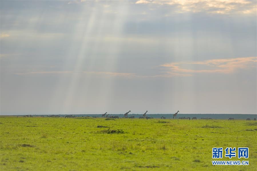 6月18日,在肯尼亚马赛马拉国家保护区,长颈鹿在草原上觅食。 新华社记者 李琰 摄