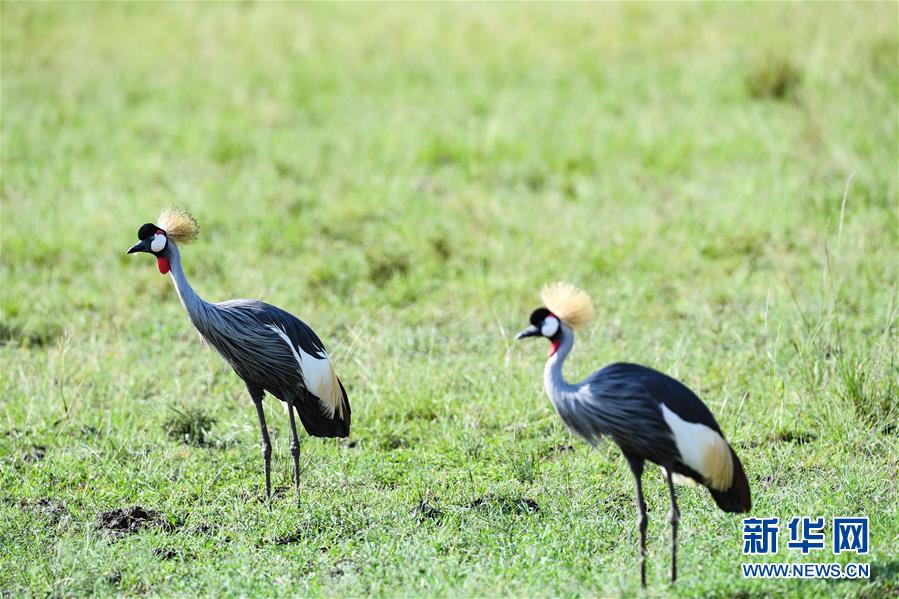 6月17日,在肯尼亚马赛马拉国家保护区,两只冕鹤在草原上觅食。 新华社记者 李琰 摄